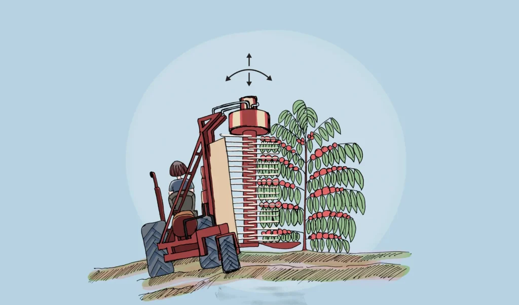 У регіонах з рівнинним ландшафтом (наприклад, Бразилія чи Австралія) активно використовують механічні збирачі. Такі машини за кілька секунд охоплюють дерево, «вичісують» ягоди обертовими шпинделями, не пошкоджуючи гілки, і спрямовують урожай у причепи. Цей метод ефективний, але вимагає правильної структури плантації — чітких рядів і достатньої відстані між деревами.