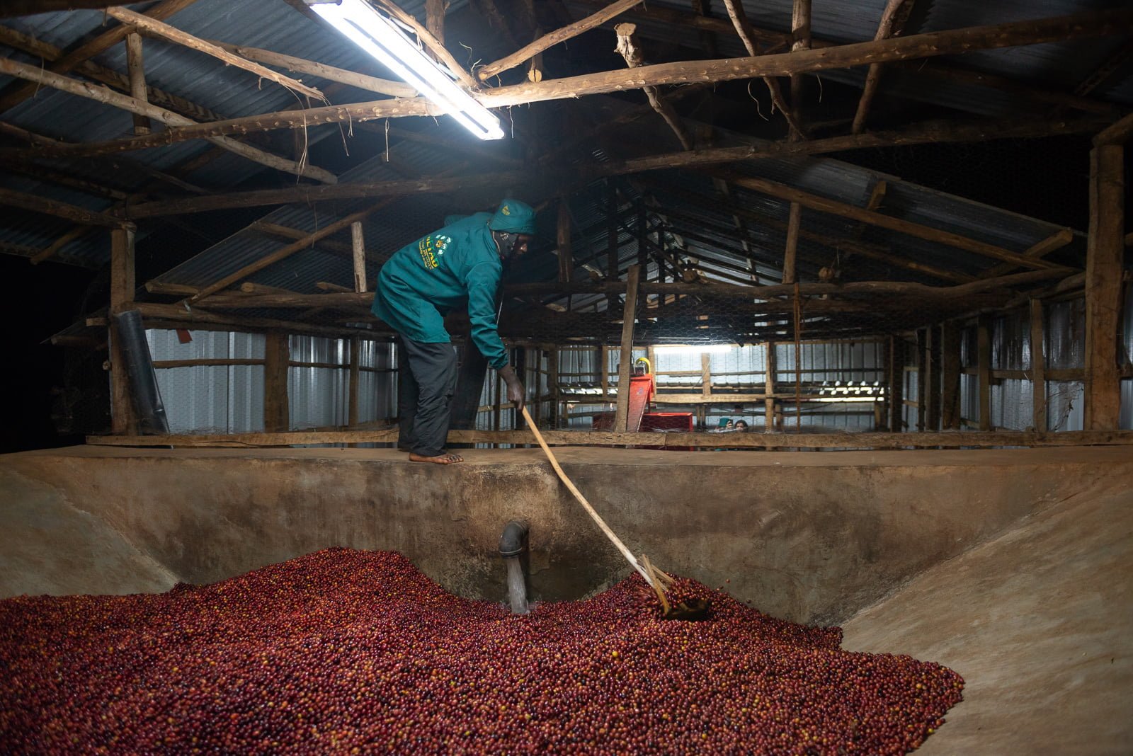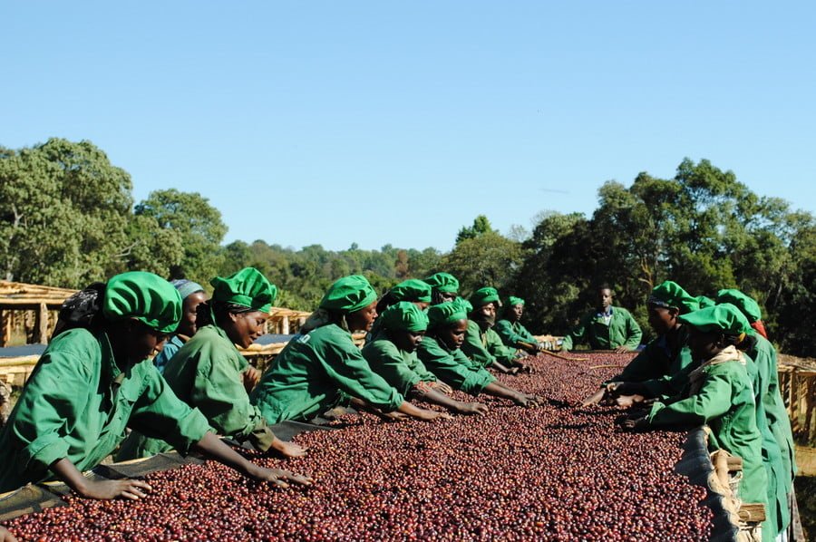Після перевірки ягоди промиваються та викладаються на африканські ліжка, де їх сушать до 21 дня, перевертаючи по декілька разів на день.