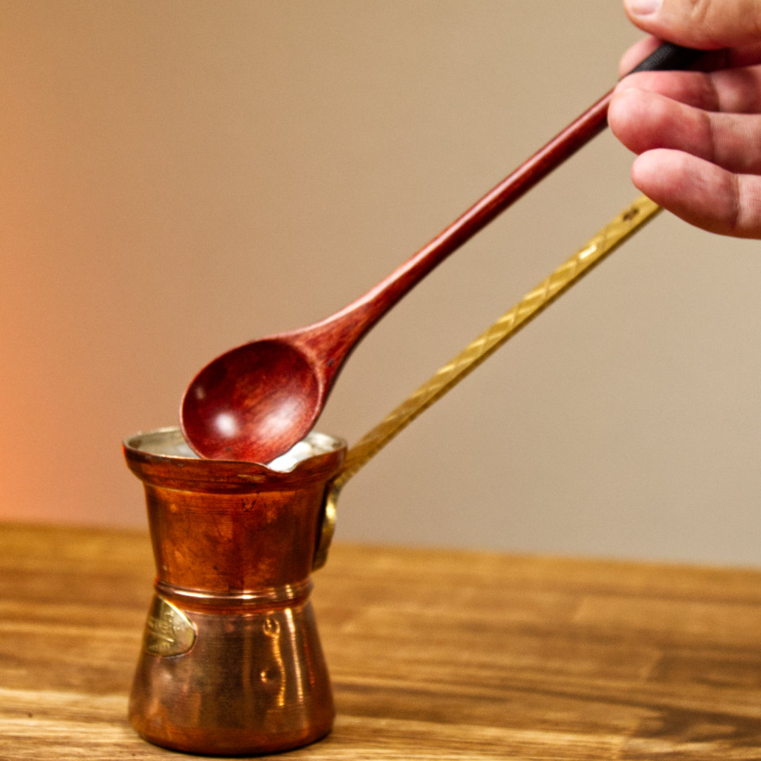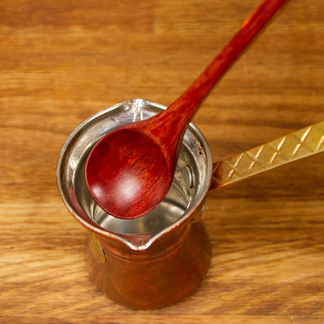 Естетична дерев’яна ложка – незамінний помічник при приготуванні кави в мідній джезві. А також – розрівнювання кави при приготування в гейзерній кавоварці.